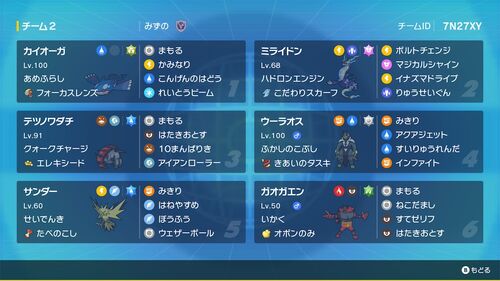 ・特定ギミックを採用しない ・相手の行動をなるべく読まない ・環境を意識しない。 →自分以外に依存しないパーティが好きなので、数値で固めてサイクル戦に持ち込みます。サイクルといえば好きな構築が前作にあったのでほぼ同じ形で組みました。 よってこち…